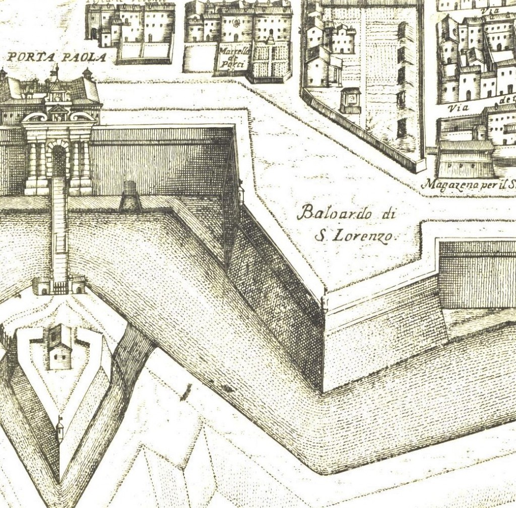 Built in 1583 under the technical planning and supervision of architect Giovanni Battista Aleotti (1546-1636) the Baluardo di San Lorenzo was renovated in the papal period (during which it was also referred to as the Baluardo di Sant'Agnese - Bastion of Sant’Agnese - defending the gate of the same name facing the current-day Via Spronello and Via Scienze). Along with the previous Baluardo di San Paolo (Bastion of Saint Paul), it constituted part of the defensive system built to protect the Porta Paola gate, built in 1612. In the early twentieth century, the top of the bastion was used for the weekly market, and thus was commonly known as the ‘Horse Market’. The bastion’s terreplein, height and escarpments were modified precisely for this purpose. Still today, the area carries out its function as a market (on Mondays), in addition to being used as a car park.