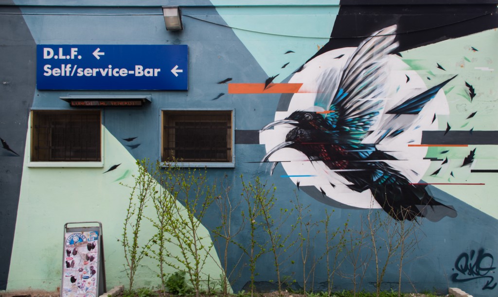 Vida Krei, da quando si è insediata, ha rinnovato completamente gli esterni e parzialmente anche gli interni dello stabile. La situazione è fluida, le decorazioni cambiano velocemente. Attualmente si possono vedere le opere di Psiko – che negli ultimi anni si sta dedicando soprattutto a suggestive rappresentazioni di uccelli in volo, catturati nei loro movimenti grazie alla tecnica del glitching – i pattern iconici, pop e minimali, di Human Alien, il ritratto di donna realizzato da Mendez, l’albero surreale di Stefano Capozzi, il grande intervento figurativo di Macs: un ragazzo assieme a una scimmietta, accucciata sulla sua spalla.
